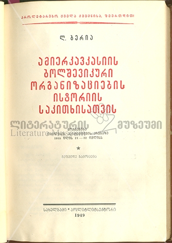 ტ-25. ბერია ლ. ამიერკავკასიის ბოლშევიკური ორგანიზაციების ისტორიის საკითხისათვის, მეშვიდე გამოცემა, სახელგამი, პოლიტლიტსექტორი, 1949 (1)