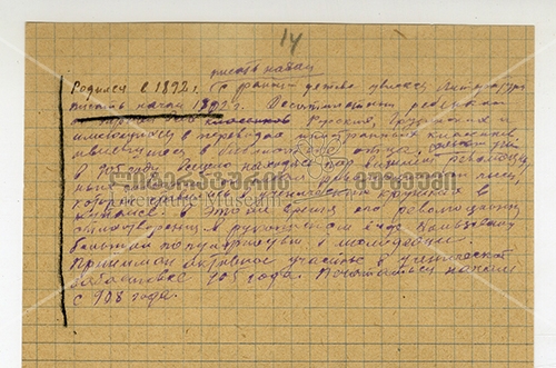 Родился в 1892 г. Писать начал с раннего детства, увлекся литературой. Писать начал 1902 г. Десятилетным ребенком [он перечел всех классиков] русских, грузинских и имеющихся в переводах иностранных классиков, имевшихся в библиотеке отца, сельского учителя. В 905 году всецело находясь под влиянием революционых событий, он писал революционные пьесы, которые ставились в ученических кружках в Кутаисе. В это же время его революционные стихотворения в рукописном виде пользовались большой популярностью в молодежи. Принимал активное участье в ученической забастовке 905 года. Печататься начал с 908 года.