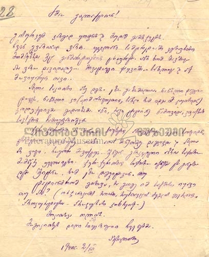 ჯერ-ჯერობით არ მინდოდა, სავსებით ამოგვეხოცა ფეხი სოფლიდან. კრამიტით გადავხურე... ოთხი ათას მანეთამდე დაგვიჯდა და ახლა არ ვიცი, როგორ მოვიქცეთ... შენგან გარკვეული აზრია საჭირო. მომწერე ყველაფერი. ჯერ-ჯერობით საჭირო იქნება, ეს განცხადება შეიტანო, რომ ეზო დაგვიტოვონ.