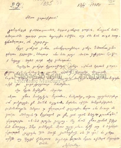 ახლა ერთი საინტერესო საკითხია, რომელსაც, იმედია, უყურადღებოდ არ დასტოვებ. ეს მიწის ნაკვეთია, საჭირო იქნება მიწადმოქმედების კომისარიატში მისვლა და ქაღალდის გაკეთება. სულ ორი საათიც არ გინდა ამისათვის და ჩვენთვის კი ეს, ვინ იცის, რამდენად ეღირება! ქაღალდები ორ-სამ დღეში გააკეთე. ასე რომ, ერთი კვირის შემდეგ რომ ჩამოვიდე, მზად დამხვდეს. ახლა უკვე დროა. ჩემზე თუ არ მოხერხდება ქაღალდის გაკეთება შენი მაინც გაამზადებინე. აბა, შენ იცი! რა კარგი იქნება, თუ შედეგს წერილით მაცნობებ. სალამი ჩვენი ოჯახიდან პატივცემულ ნინას.