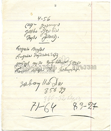 დღიური-482-7 - 1950-იანი წლები 4-56. ლეო გვათუა. ჟორა ჟვანია. შურა ტაბიძე.როგორი ამიდებია, როგორაა მუშაობის საქმე, დაიწყეს თუ არა მეორე სართულის კედელი, როდის იქნება მზად საბოლოოდ?Завод Им. Дм. 356-99.360-32. პარტერში. 71-64. 83-27.