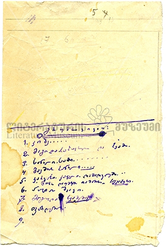 1. კიბე... 2. მაგიდა საზაფხულო და სკამი. 3. საწოლი. სამი... 4. ბავშის საწოლი... 5. კარკასი. კაფელი. ღრმაღელეში... ნინო დაუბარებს თამარს. საკვამური. 6. პატარა შკაფი. 7. მაგიდა. სკამები. 8. ფარდები.